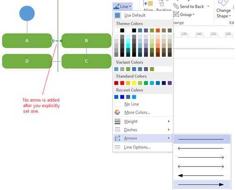 3. Add Arrowheads: Just like with the Connector tool, right-click on the line and go to Format Shape . In the Line section, choose your desired Begin Arrow type and End Arrow type . You can also adjust the size and color of the arrowheads. The Format Shape pane provides a comprehensive set of options for customizing the appearance of your lines and arrows, allowing you to create a visual style that matches your diagram’s overall design and purpose. Experiment with different arrowhead styles, sizes, and colors to find the perfect look for your arrows.