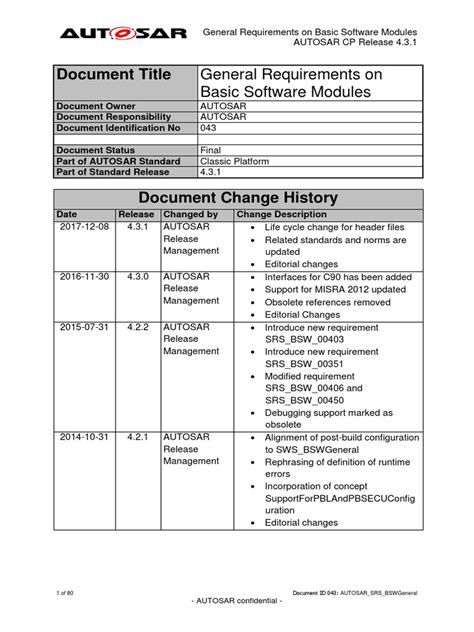 The adoption of AUTOSAR has become widespread in the automotive industry, with major car manufacturers and suppliers embracing it as the de facto standard for automotive software development. By adhering to AUTOSAR principles, developers can create more robust, reliable, and maintainable software systems, paving the way for innovative automotive applications and enhanced driving experiences. So, in essence, AUTOSAR isn’t just a trend; it’s a fundamental shift in how automotive software is developed, deployed, and maintained. Keeping that in mind will help contextualize the SRS BSW doc.