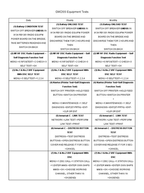 Let’s get down to the nitty-gritty on testing your VHF and MF/HF radiotelephones , the backbone of your GMDSS communication. For your VHF radio , the first thing you want to check is its power supply. Is it receiving stable power? Then, fire it up and check the display for any error messages. Next, perform a transmit and receive test on a designated working channel, ideally one used for routine communication or a simplex channel. You can often do this with another vessel or a shore station if possible, but even a simple check of your own transmission with a handheld meter can indicate if the power output is within acceptable limits. Crucially, you must test the DSC function . This involves initiating a test call to a designated DSC test station or, if available, your shore-based maintenance provider. This verifies that your vessel’s Maritime Mobile Service Identity (MMSI) is correctly programmed and that the radio can successfully transmit a DSC call. Never use the DSC distress button for testing unless specifically instructed to do so by a recognized authority during a controlled test. For your MF/HF radio , the testing process is similar but on a different scale. Power up and check for errors. Test transmit and receive on various frequencies relevant to your operational area. Again, if possible, conduct tests with shore stations or other vessels. The MF/HF DSC testing is equally vital. You’ll perform test calls to shore stations, ensuring your MMSI is transmitted correctly and that you can establish a digital connection. Don’t forget to check the antenna system – a compromised antenna can cripple your transmission and reception capabilities. Guys, these tests ensure that when you need to send that critical Mayday call or receive a vital safety alert, your voice and data will travel where they need to go, loud and clear. Regular checks prevent those dreaded moments of silence when you desperately need to communicate.