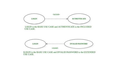 • Include: Represents mandatory functionality that must be invoked for the base use case to succeed. Think of it as a necessary step in the process.