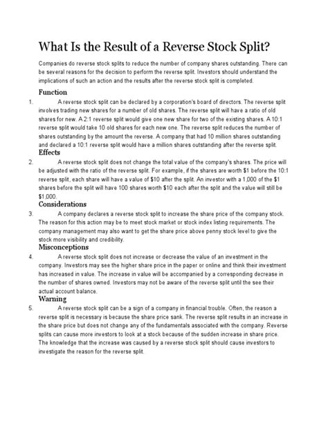 Alright, so let’s tackle the big question: what is a reverse stock split ? Imagine you have a bunch of small, individual puzzle pieces, and you decide to combine them into fewer, larger pieces. That’s essentially what a reverse stock split does for a company’s stock. Instead of having, say, 100 million shares floating around, the company decides to consolidate them. For example, they might do a 1-for-10 reverse split, meaning for every 10 shares you currently own, you’ll end up with just 1 share. But here’s the kicker: the total value of your holdings should, in theory, remain the same immediately after the split. So, if your 10 shares were each worth \(1, totaling \) 10, after the 1-for-10 split, you’d have 1 share worth $10. The number of shares decreases, and the price per share increases proportionally. It sounds simple, but the reasons behind it and the effects can be pretty complex, guys. Companies usually do this when their stock price has fallen significantly, often below a certain threshold that’s important for listing on major stock exchanges or for attracting institutional investors. It’s a way to artificially boost the share price without changing the company’s fundamental value overnight. Think of it as a cosmetic change designed to make the stock look more attractive or compliant.