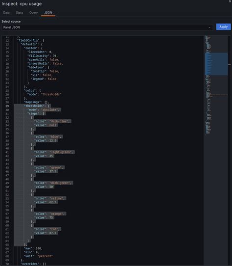 Understanding the fundamental components of Grafana Panel JSON is crucial for anyone looking to truly customize their monitoring solutions. At its core, each panel’s JSON defines its id , type (e.g., graph , stat , table ), title , and description . These are the high-level identifiers that give your panel context. But the real magic happens within nested objects like fieldConfig , options , and targets . The fieldConfig section is where you dictate how specific data fields are displayed, allowing you to set units, value mappings, thresholds, and even color schemes based on data values. This level of granular control means you can make your panels visually intuitive, highlighting critical metrics at a glance. For instance, you could configure a ‘CPU Usage’ panel to turn red when it exceeds 90%, immediately drawing attention to potential issues. The options object, on the other hand, handles the general visualization settings specific to the panel type. For a graph panel, this might include axis settings, legend visibility, tooltip behavior, and line interpolation. For a stat panel, it defines how the main value and auxiliary values are shown, including text size and display mode. Mastering these settings through JSON allows for a level of precision that simply isn’t possible through the UI alone, enabling you to craft truly unique and highly functional visualizations that perfectly suit your operational needs. It’s all about providing value and clarity to your team, guys, and the JSON is your paintbrush!