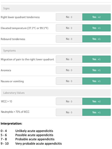 • Symptoms: This is where things start, with the patient’s reported symptoms. The score considers symptoms such as abdominal pain, its location, and the severity. The presence of nausea, vomiting, or loss of appetite can also contribute to the score. These subjective reports from the patient give clues about the inflammation and irritation caused by the appendicitis. A patient’s description of their pain, including how it started, its location, and what makes it better or worse, can be really helpful.