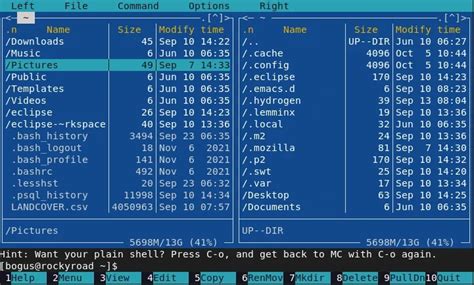 Once you fire up Midnight Commander, you’ll see the dual-pane interface. Here’s how to navigate and perform basic operations: