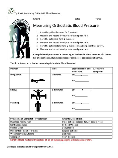 Now, let’s talk about why this orthostatic blood pressure test form is actually a big deal. You might see it as just another clipboard and pen situation, but trust me, it’s a crucial piece of the diagnostic puzzle. First off, accuracy and consistency are paramount when measuring blood pressure, especially in this context. When a healthcare professional uses a standardized form, it ensures that the measurements are taken correctly and at the precise moments required. This includes taking your blood pressure and heart rate while you’re lying down, then immediately after you stand up, and then again after a few minutes of standing. Without a form to guide this process and record the findings, it would be easy to miss subtle but important changes. The form provides a structured checklist of sorts, ensuring all necessary data points are captured. It documents your baseline readings, the readings after the positional change, and the duration each reading was taken. This methodical approach allows doctors to see not just if your blood pressure drops, but how much it drops and how quickly . This detailed information is critical for distinguishing orthostatic hypotension from other conditions that might cause similar symptoms. Furthermore, the form serves as a vital record for tracking your health over time. If you need to undergo this test multiple times, perhaps to monitor the effectiveness of a new medication or treatment, the historical data on the form is invaluable. It allows you to see trends, making it easier for you and your doctor to assess progress or identify recurring issues. For patients experiencing symptoms, having this concrete data can be incredibly reassuring, transforming vague feelings of unwellness into a diagnosable condition with a clear path forward. So, next time you’re asked to fill one out, remember its significance – it’s your personal health data being meticulously recorded for your well-being.