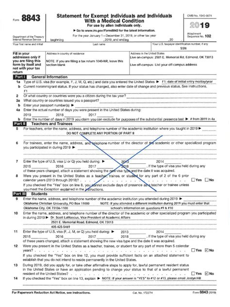 Alright, let’s get down to the nitty-gritty: how do you actually fill out Form 8843? Don’t worry, we’ll break it down part by part. This form is divided into several sections, and you’ll only need to complete the parts that apply to you. First off, at the top, you’ll enter your identifying information: your name, address, and social security number (SSN) or individual taxpayer identification number (ITIN) if you have one. If you don’t have an SSN or ITIN, you can often leave that blank, but check the form instructions to be sure. Part I is generally for everyone filing the form. Here, you’ll provide basic information about yourself, like your date of birth, country of citizenship, and country where you generally pay taxes. Part II is specifically for students. If you’re here on an F or J visa as a student, you’ll complete this part. You’ll need to provide details about your educational institution, its address, and the dates you were present in the US during the tax year. You’ll also need to state the number of days you were present in the US. This is super important for determining your residency status for tax purposes. Part III is for teachers and trainees. If you’re in the US for academic or research purposes as a teacher or trainee on a J visa, you’ll fill this out, providing similar details about your institution and duration of stay. Part IV is for medical condition exceptions. This part is less common but applies if you were unable to leave the US due to a medical condition. Part V is where you’ll report the number of days you were present in the US during the tax year. This calculation is critical. You need to count every day you were physically in the US. There are specific rules for counting days, especially if you arrived or departed during the year. Part VI is for family members filing a joint statement. If you’re married and your spouse is also an exempt individual, you might file jointly here. Finally, make sure to sign and date the form. Crucially, always refer to the official IRS instructions for Form 8843 for the most up-to-date and detailed guidance. They have specific definitions and rules that are essential for accuracy. Don’t just guess; consult the IRS instructions! It’s your best friend for getting this right.